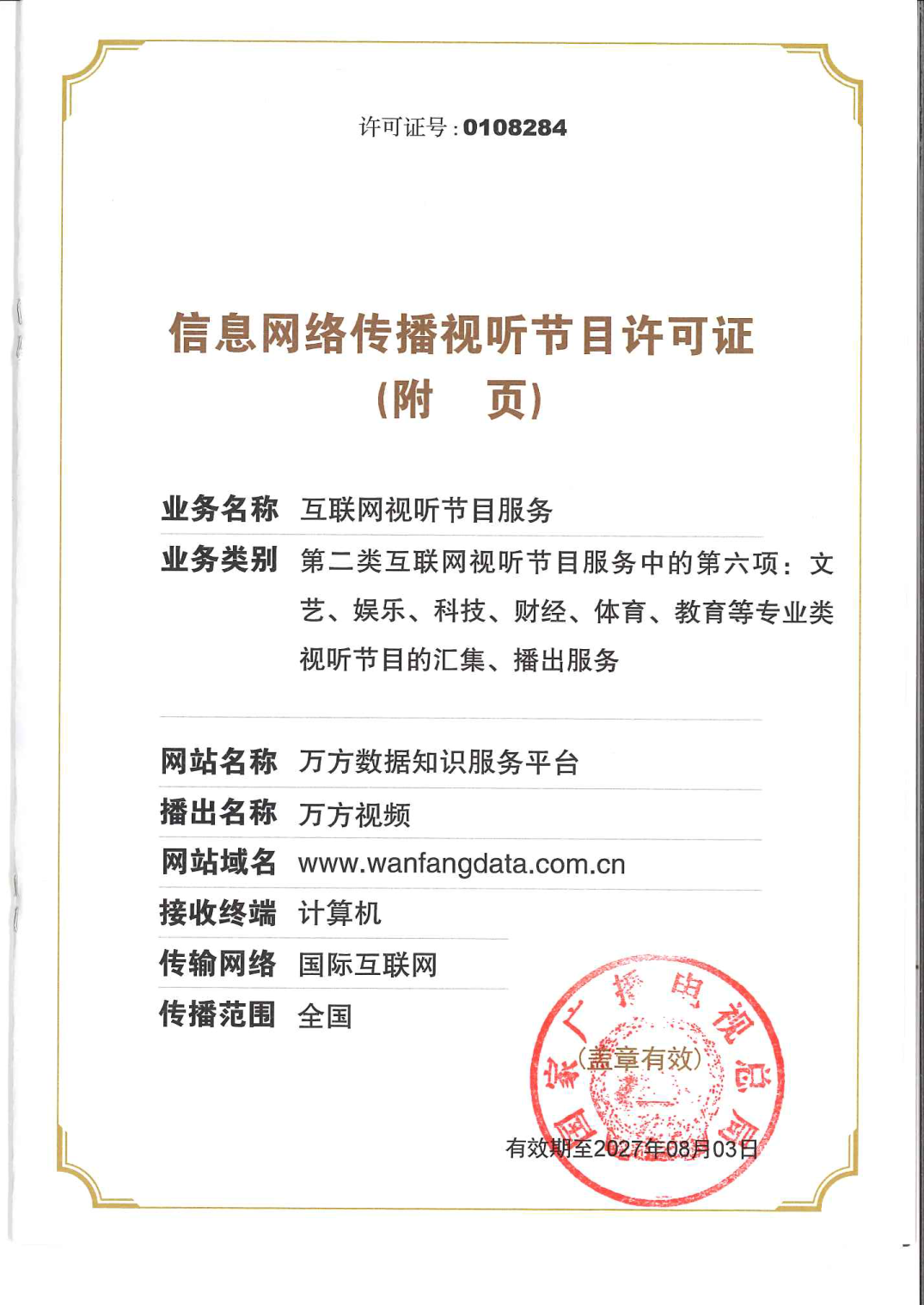 信息网络传播视听节目许可证(国家广播电影电视总局颁发)